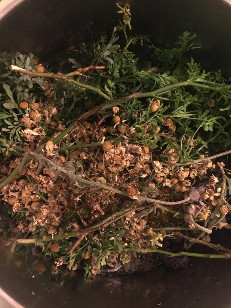 Yo mezclé manzanilla, lavanda y ruda y lo dejé por 30 minutos en agua hervida tapada. Me dio vida, y me hizo pensar en las enseñanzas de las abuelas y las plantas.