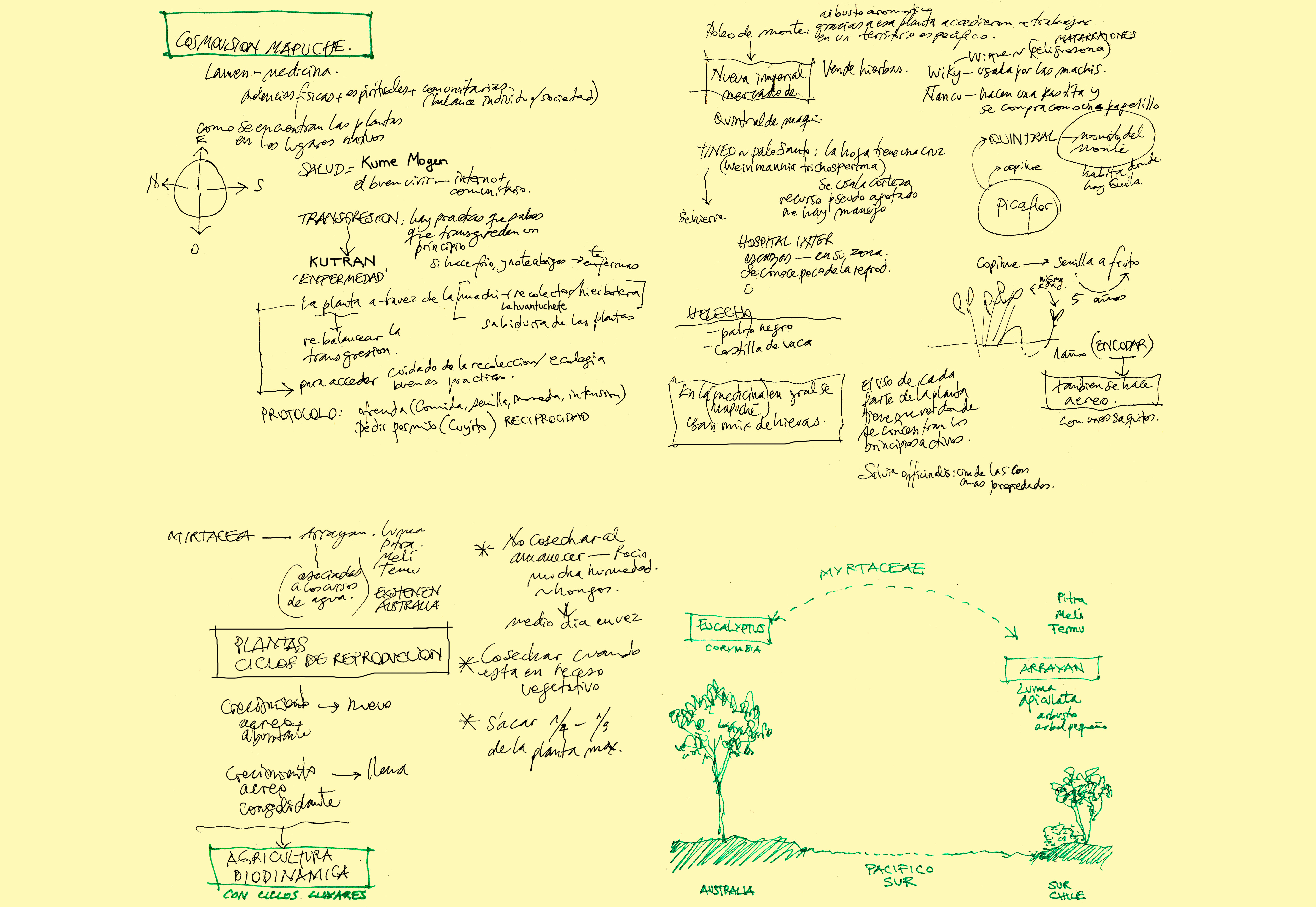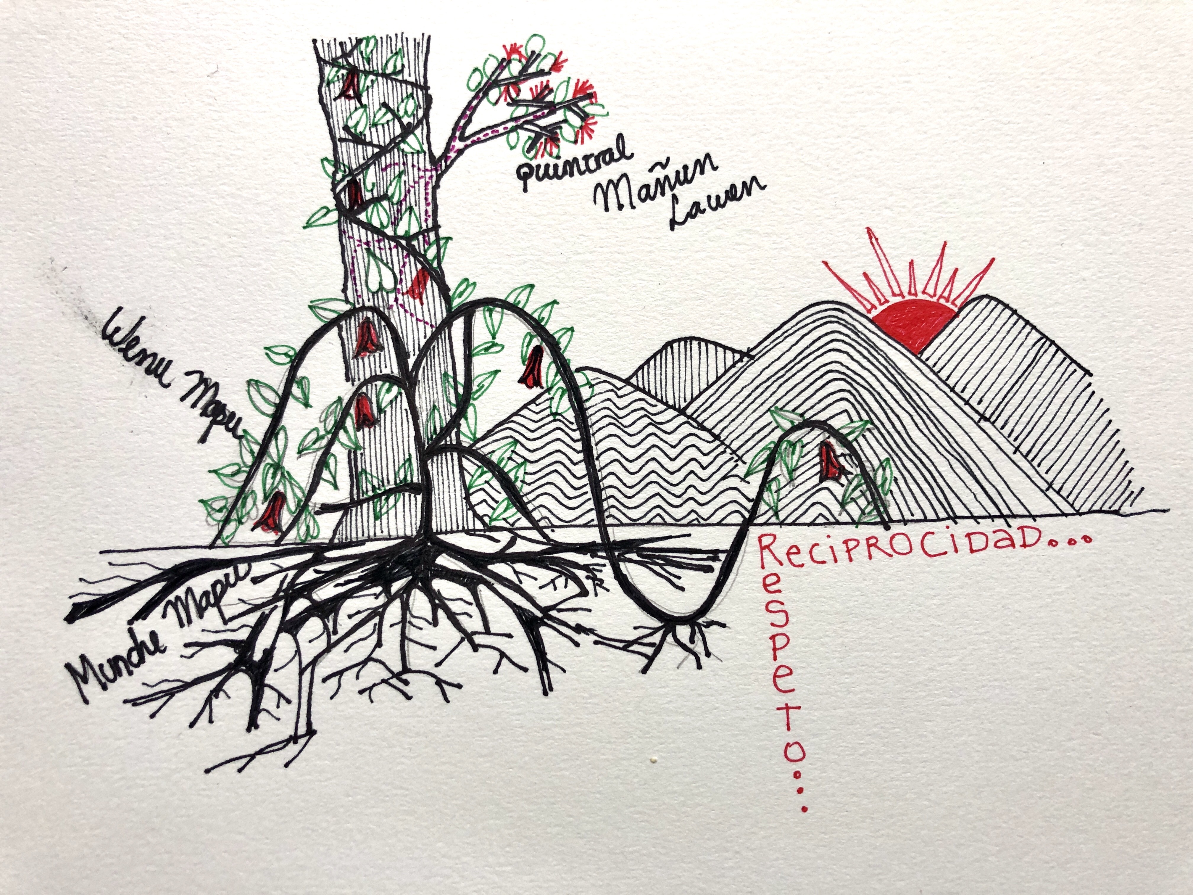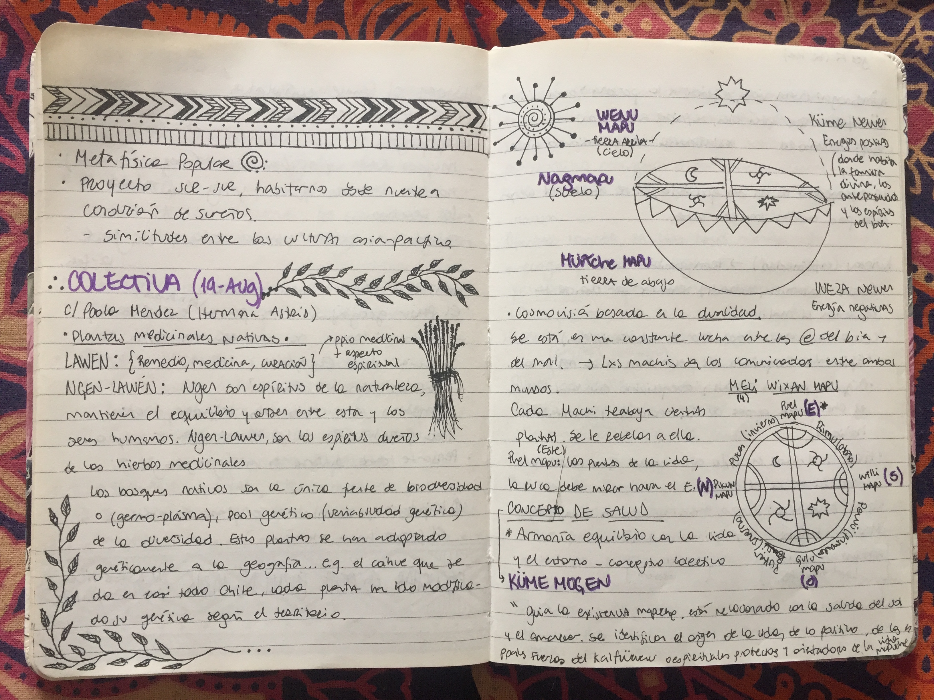 Comenzamos aprendiendo sobre la cosmovisión Mapuche, la cual se basa en la dualidad, una constante lucha entre las energías del bien (Küme newen) y del mal (Weza newen). Son lxs Machis lxs comunicadores entre ambos mundos. Cada machi trabaja ciertas plantas y estas le revelan conocimiento. También encontramos a lxs Lawentuchefe, que tienen conocimiento herbolario y su aplicación de éstas como medicina. Sin embargo, el trabajo de lxs Machis, a diferencia de Lawentuchefe, es a un nivel mágico, espiritual, reestrablececiendo el balance natural en una situación de transgresión con la comunidad, el territorio ao las emociones. En general han sido las mujeres las que han guardado y protegido los saberes de las plantas, la medicina y las practicas tradicionales.